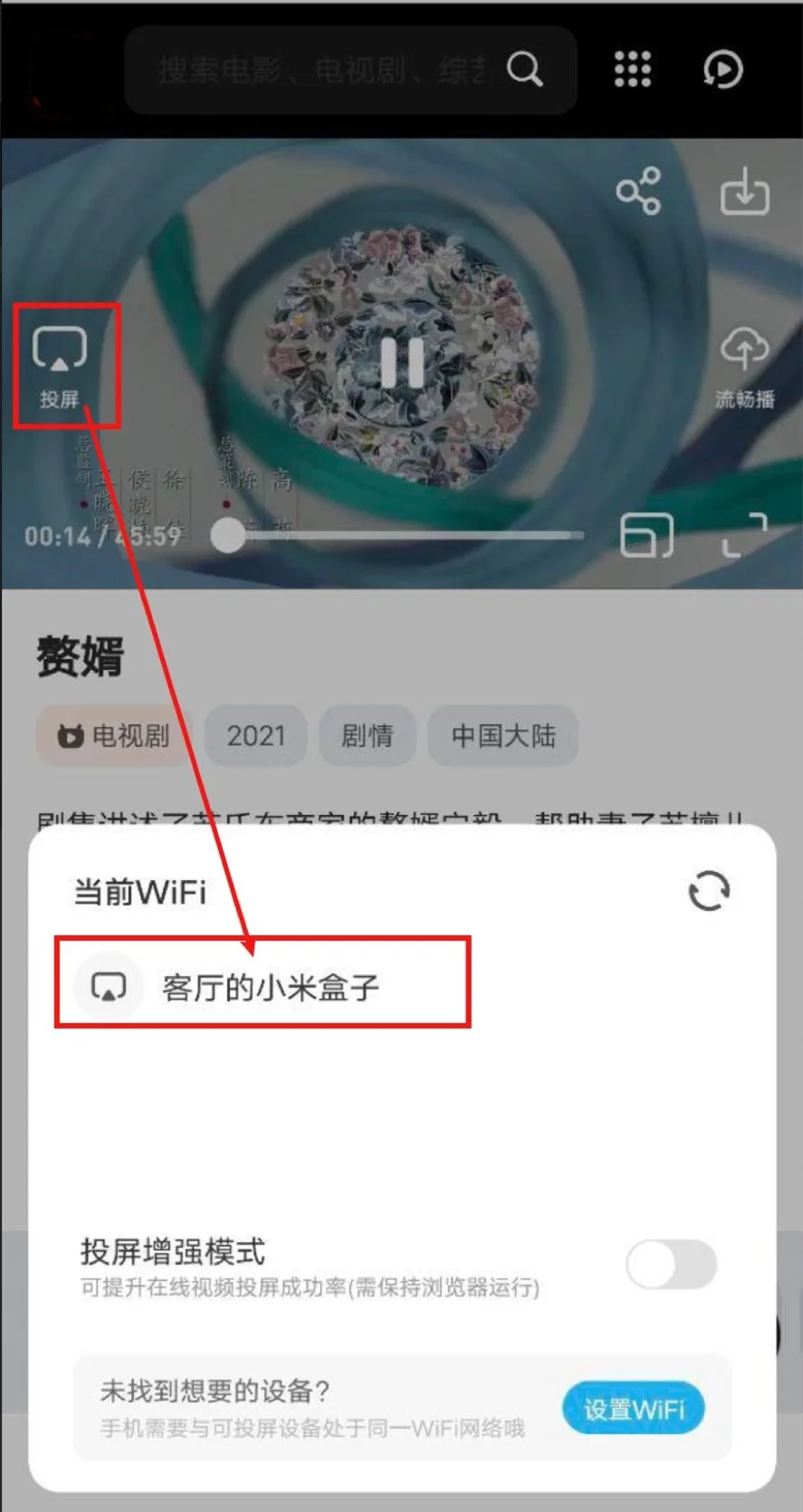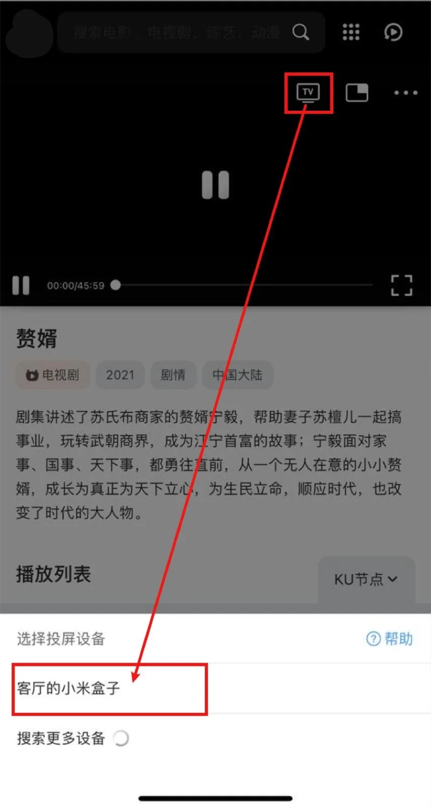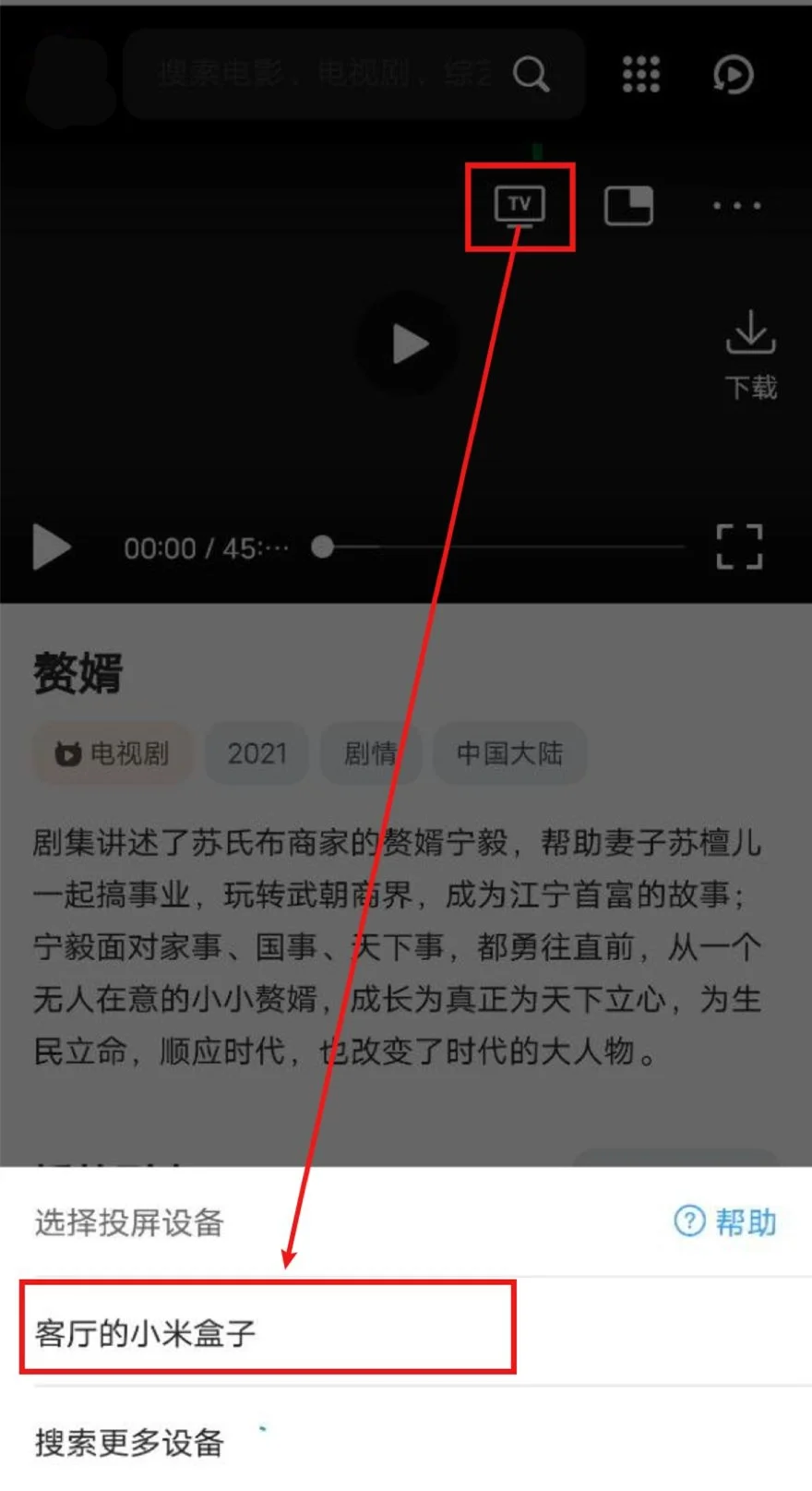 打开QQ浏览器(会接管网页播放器)->打开江南影视->播放视频->选中投屏图标->等待搜寻出智能电视/电视盒子->选中,即可投屏。