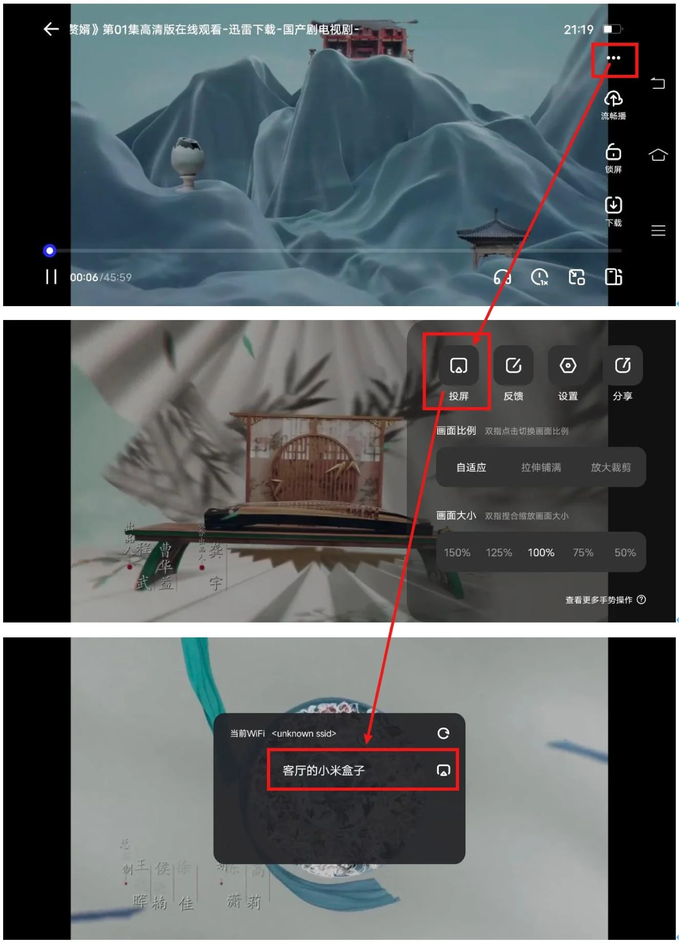 打开安卓UC浏览器->打开江南影视->开始播放->全屏->左下角投屏->等待搜寻到智能电视/电视盒子->选中,即可投屏。